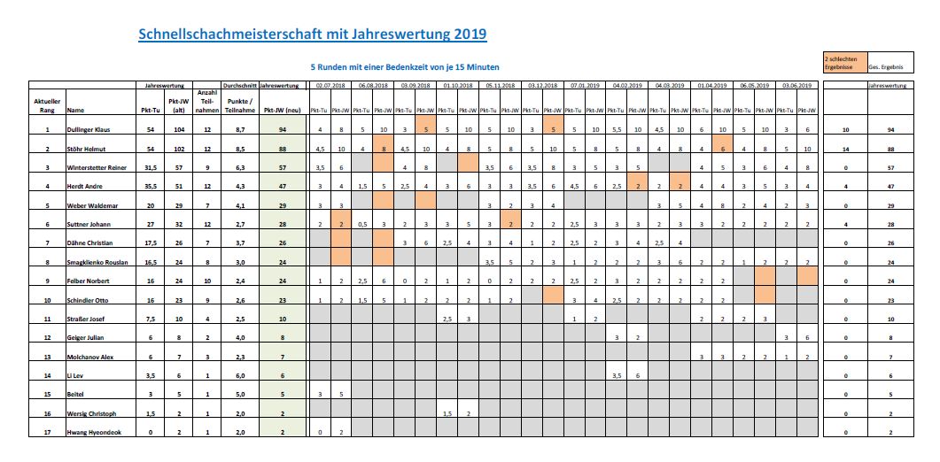 Die diesjährige Kurzzeitmeisterschaft konnte Helmut Stöhr, vor Reiner Winterstetter und Klaus Dullinger entscheiden. Die genauen Resultate sehen sie hier: 2017_Schnellschach15 min