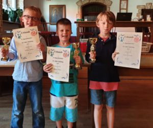 Die Gewinner der Altersklasse U-8 (vlnr) : Ipatov,Aleksej (SK Töging), Hepp,Daniel (SC Wolfratshausen), Newzella,Felix (SK Gräfelfing)