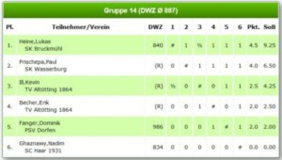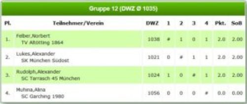 Die beiden Jugendlichen Kevin und Erik hingegen hatten es mit einem 6er-Feld zu tun und konnten mit 2,5 bzw. 2 Punkten ein zufriedenstellendes Ergebnis erreichen. Auch wenn die Zahlen in diesem Bereich noch nicht so aussagekräftig für die Spielstärke sind, so kann man doch erfreut sein, einen Spieler mit einer DWZ von knapp unter 1000 (Fanger Dominik; Dorfen) hinter sich gelassen zu haben.