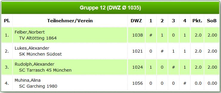 Dabei ergab sich in der Gruppe 12 nach 4 Runden die Sonderheit, dass gleich 3 von 4 Spielern Punkt- und Wertungsgleich an der Spitze lagen, darunter auch Norbert Felber.