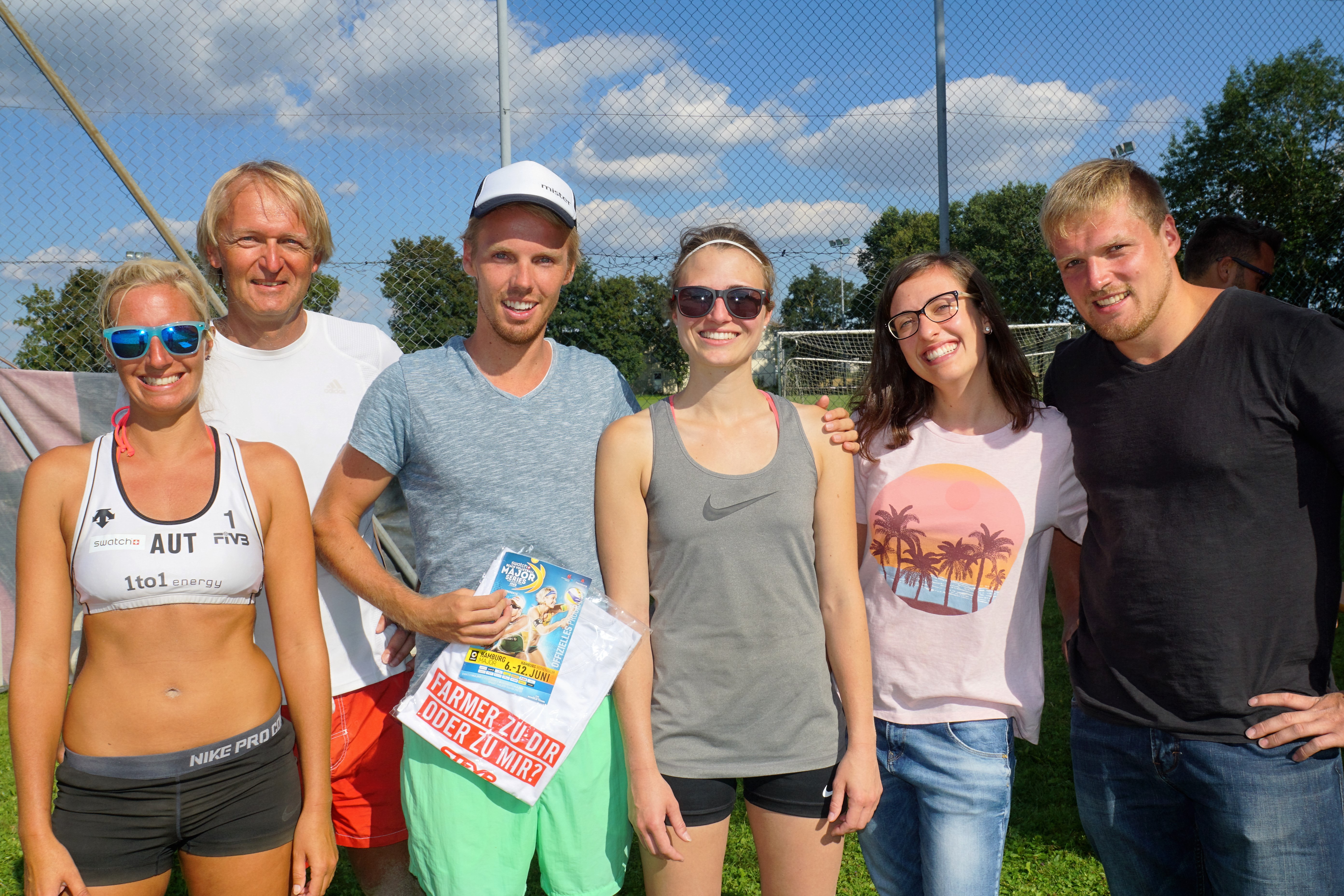 Die verdienten Stadtmeister im Mixed-Beachvolleyball: Anna-Catharina Kaiß und Markus Thoma(Bildmitte) umgeben von den starken Österreichern Betty Blum und Manfred Hackl aus Braunau(links, Zweite) und Christine Trieflinger und Christian Mühlbacher(Wurmannsquick/Treubach, Sieger 2014, Dritte)